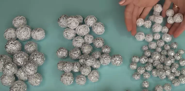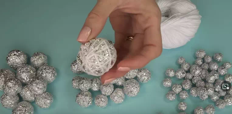 Затем обмотайте некоторые шарики любой пряжей белого цвета.
