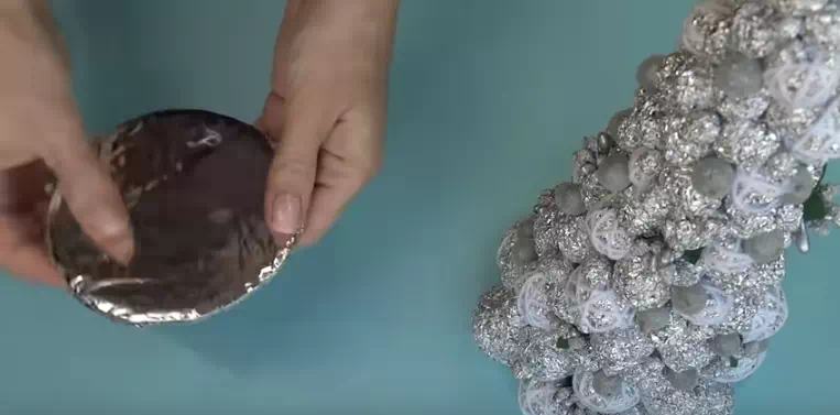 Осталось сделать из фольги донышко и вклеить его в основание ёлки, для этого вырезаем круг из картона и заворачиваем его в фольгу.