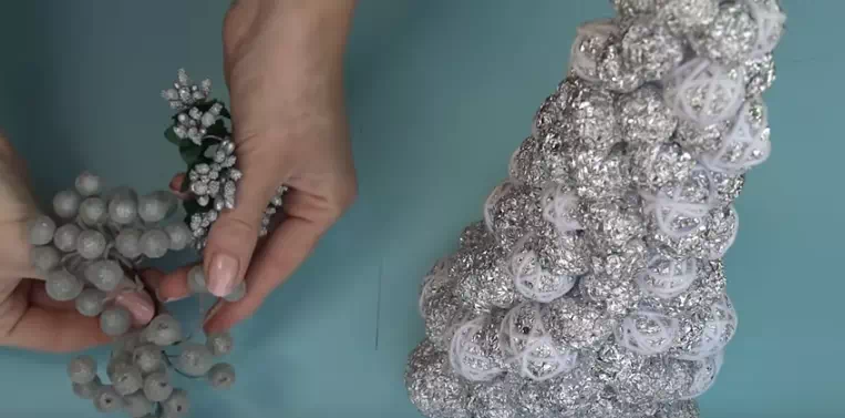 Сверните из листа бумаги конус, склейте его, чтобы не раскрутился. На него, начиная с основания, приклеивайте в произвольном порядке шарики, чередуя размеры.