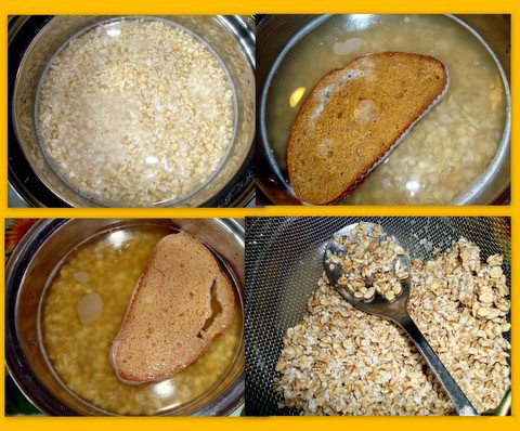 - Овсяные хлопья (не быстрого приготовления!) залить литром воды, перемешать, добавить 1 ломтик хлеба.