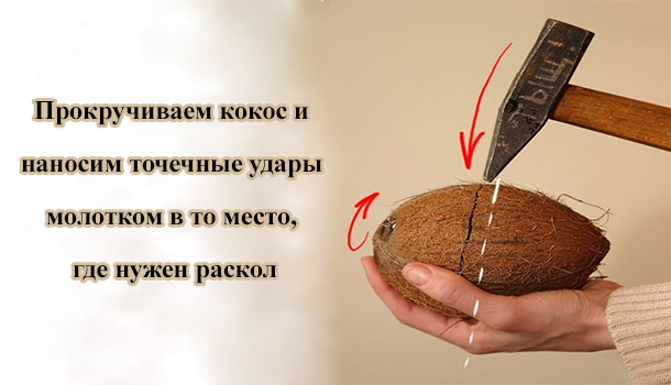 - Возьмите в руку молоток, во вторую кокос и бейте в центр, проворачивая его после каждого удара.