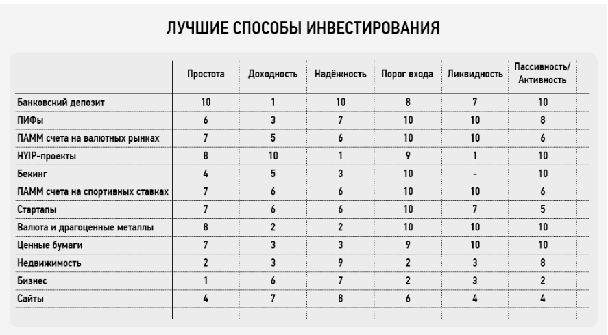 Для простоты и эффективности понимания предлагается рейтинговая таблица сравнения лучших способов инвестирования, включающая важные характеризующие параметры.