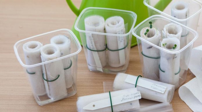 Предприимчивые садоводы, стремясь рационализировать процесс выращивания перца на рассаду, придумали следующее: из туалетной бумаги делается скрутка внутри которой раскладывают семена. В домашних условиях для размещения емкостей не понадобится много места.
