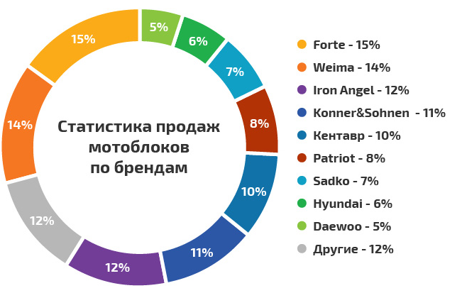 Покупая мотоблок, обязательно обращайте внимание на производителя. Чтобы было понятно, какие производители востребованы в стране, вот статистика продаж мотоблоков по брендам за 2019 год.