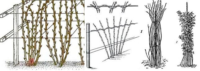 Ягоды малины очень тяжёлые для веток растения. Чтобы плодоносящие побеги не ломались, их нужно подвязывать. Это можно делать по-разному. На картинках ниже несколько популярных способов.
