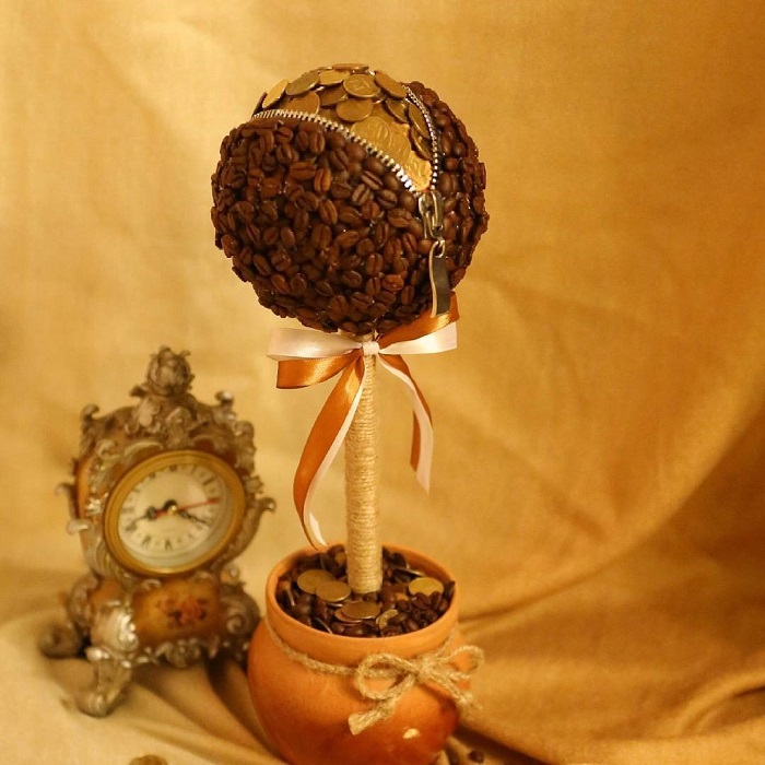 - Декорирующие элементы (монеты, зерна кофе, листья, перья и др.) крепите с помощью клеевого пистолета. Если вы задумали дерево с листьями, то их нужно крепить проволокой и клеем.