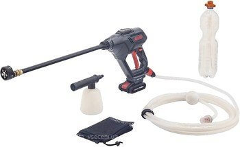 AL-KO Easy Flex PW2040 оснащена энергоэффективным двигателем, который работает тихо и рационально потребляет заряд устройства. В комплекте есть универсальная насадка с регулировкой струи в 5 разных вариантах. Наличие адаптера позволяет совмещать минимойку с пластиковой бутылкой для использования моющего средства. В комплекте есть легкий шланг с гибким фиксатором для забора жидкости. Давление 22 бар позволяет легко справиться с засохшими пятнами и грязью.