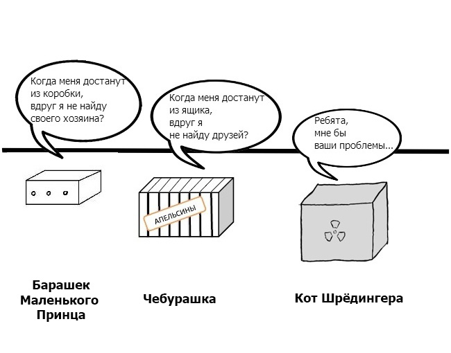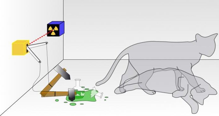 Садим кота в ящик с механизмом, который содержит радиоактивное атомное ядро, и емкостью, наполненной ядовитым газом. Эксперимент проводится с точно подобранными параметрами вероятности распада атомного ядра – 50% за 1 час. При распаде ядра происходит утечка газа из емкости, что приводит к смерти кота. Если же этого не происходит, с котом ничего не случается, он живой и здоровый.