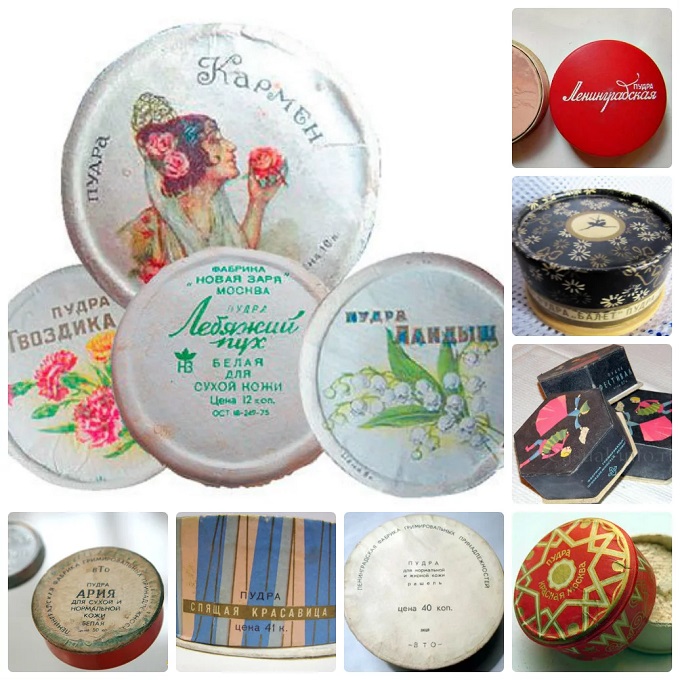 Пудра была гораздо популярнее тонального крема, но ассортимент тонов, пудры советского производства, был все также скудный. Самыми доступными были пудры "Кармен" и "Ландыш". Они были в неудобных картонных коробках и очень напоминали окрашенный и растертый в порошок мел. Из компактных пудр самыми распространенными были "Декор" и "Елена". Именно они лежали в каждой сумочке модниц того времени.