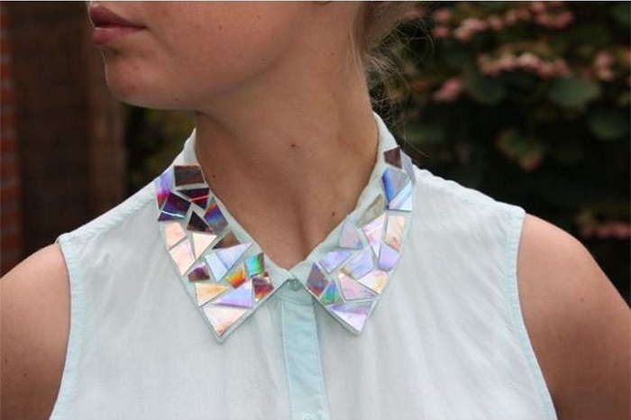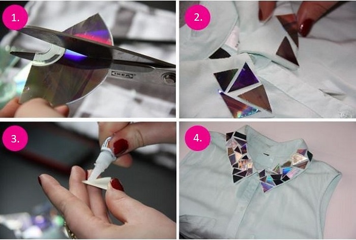 Итак, возьмите диск, произвольно вырежьте из него различные формы, какие вам нравятся. Приложите к воротнику, красиво разместите на нем. Универсальным прозрачным клеем (можно взять горячий клей) аккуратно приклейте к воротнику. Теперь вы – обладатель оригинальной вещи, сделанной своими руками.