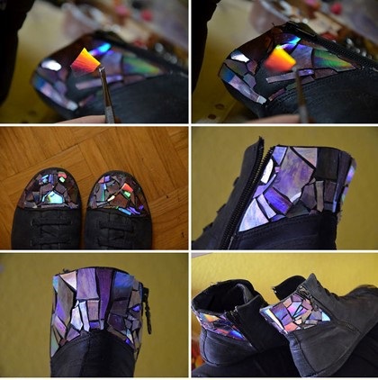 Преобразить старую обувь или примешать к спортивному стилю немного гламура можно также с помощью обычных компакт-дисков.