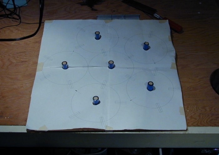 Возьмите один диск и разделите его на 5 одинаковых частей – это будет наш трафарет для работы с остальными дисками. Отступите пару-тройку миллиметров от конца и на намеченных линиях просверлите дырочки. С остальными дисками сделайте также, приложив к ним трафарет. Чтобы лампа была устойчивой, нужны направляющие. Для этого выберем стержни от обычных ручек.