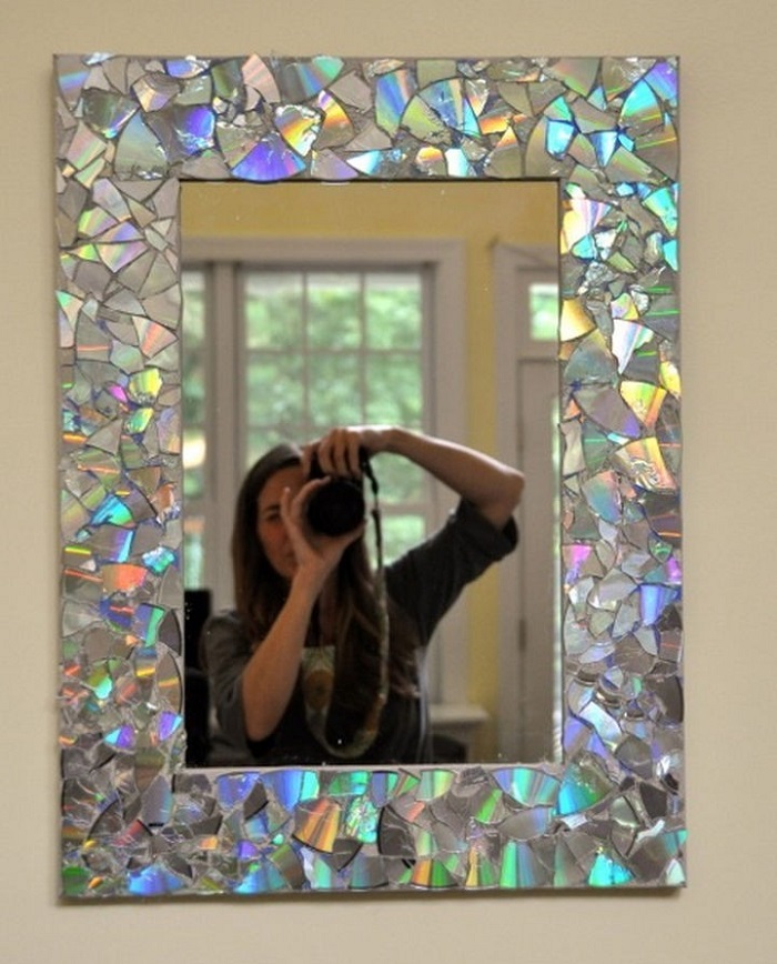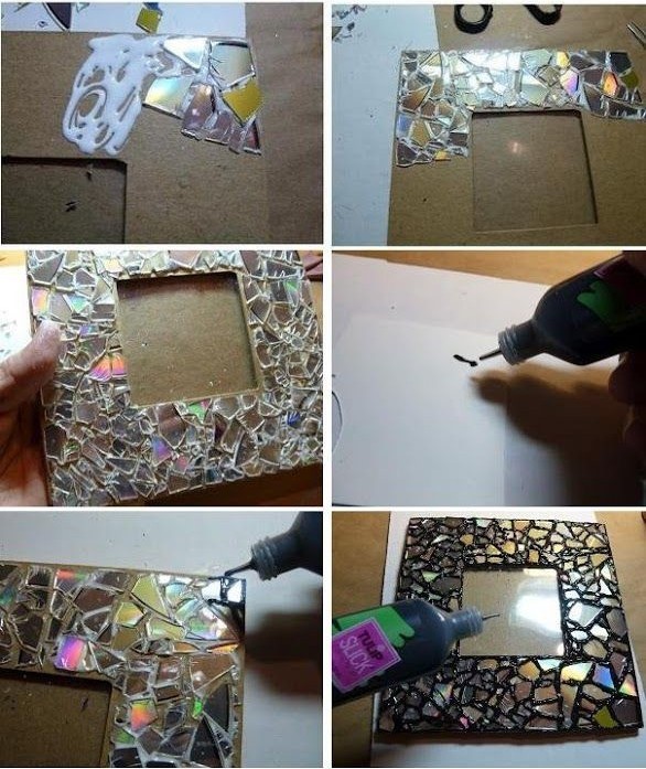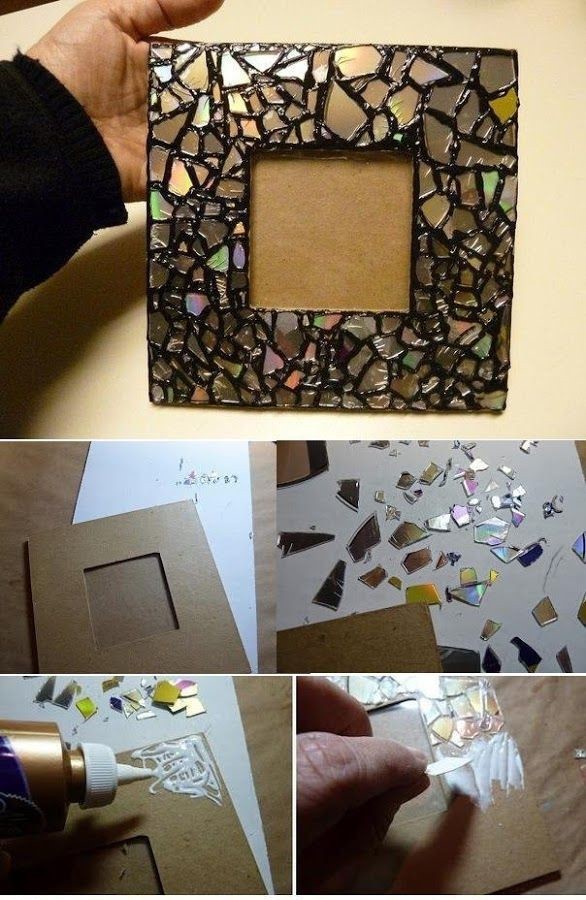 Сначала вам следует сделать из фанеры заготовку для рамочки определенной формы и размера, как посчитаете нужным. Затем разрежьте диск, намажьте края рамочки клеем, с помощью кисти распределите клей и начните приклеивать блестящие кусочки, оставляя небольшие зазоры.