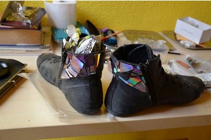 - С помощью щипцов и клея аккуратно прикрепите нарезанные кусочки к обуви.