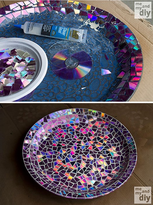 Любую тарелку, блюдо, разнос можно украсить таким незамысловатым способом. Перед началом работы приготовьте клей и порежьте диски. Кусочки не должны сильно отличаться по размеру, иначе не добьетесь нужного визуального эффекта.