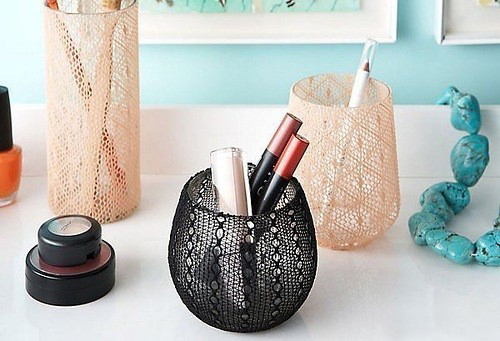 - Из поцарапанных вазочек и ажурных колготок можно сделать вполне миленькие новенькие вазочки. Баночку необычной формы можно также обернуть красивым капроном и использовать на косметическом столике.