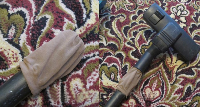 - Потеряв, к примеру, маленькую сережку, можно на трубу пылесоса надеть чулок, а затем пропылесосить ту территорию, где подозревается потеря. Чулок не даст пролететь мелким предметам в мешок для мусора, но задержит их с легкостью.