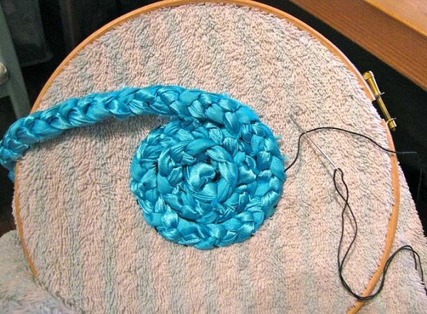 - К оставшимся 3-м концам пришейте следующие ленты и снова заплетите. Такие действия повторяйте, пока не закончится материал.