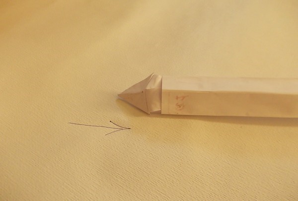 - Переверните заготовку и преступите к сооружению острия меча. Заверните самые крайние углы в центр так, чтобы они притрагивались к невидимой оси. Переверните заготовку и заверните углы в центр;