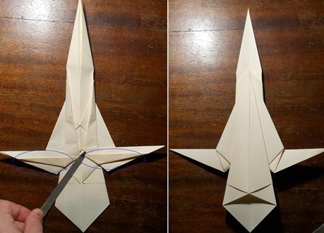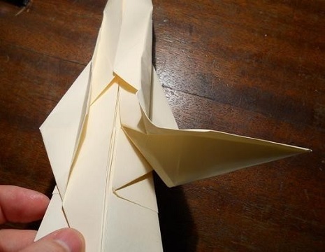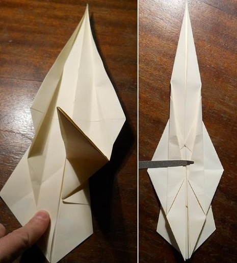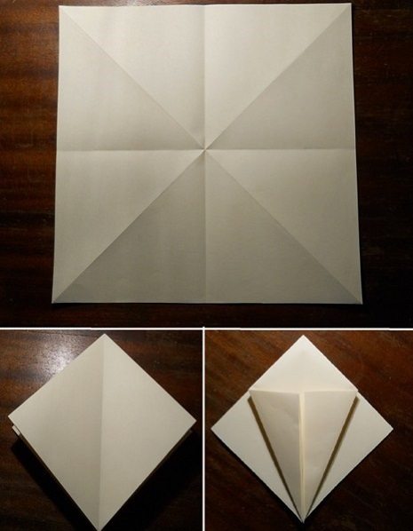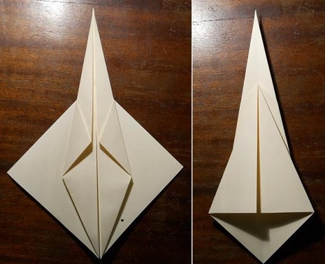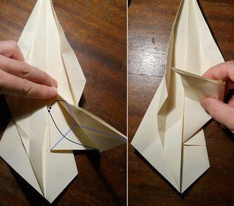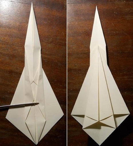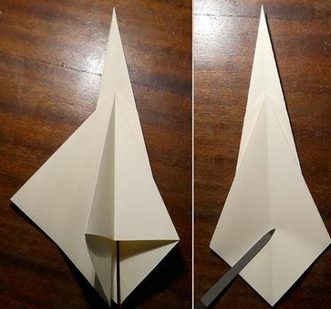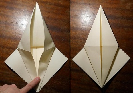 - Переверните поделку, разверните элементы, которые прижимаются к центру. Возьмитесь за правый нижний угол, раскройте заготовку. Получился треугольник, нижний кусочек которого сравняйте с осью;