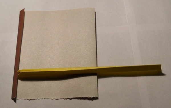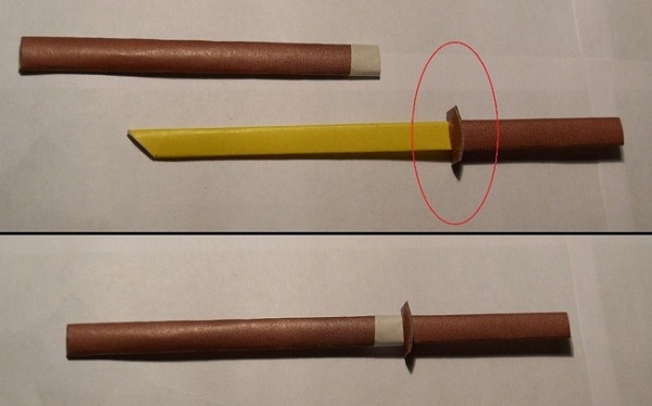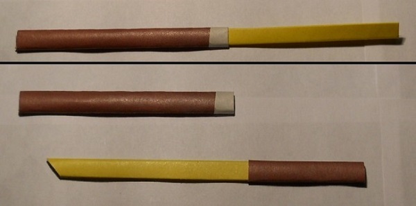 - Измерьте ширину острия, умножьте на 2 и вырежьте такого размера отрезок из коричневого листа. Немного разрезав в центре, засуньте туда клинок. Это деталь называется гарда и служит для того, чтобы рука не соскальзывала с рукояти на лезвие;