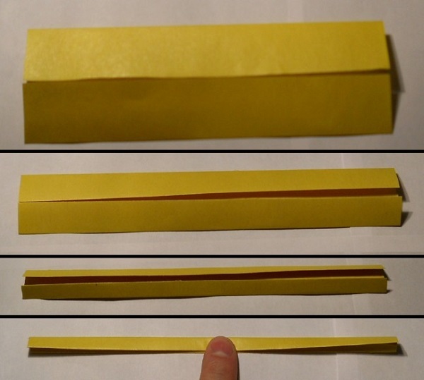 - Сложите вдвое лист желтого цвета и отметьте середину. Разверните. Теперь к ней заверните обе стороны и снова сложите вдвое;