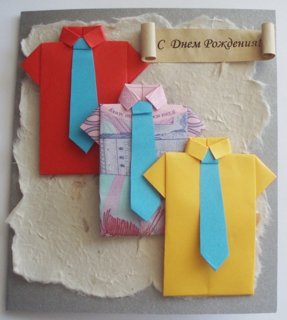 Чтобы поразить своих близких мужчин оригинальной упаковкой для подарка плоского типа, положите презент в бумажную рубашку, сделанную по технике оригами. Туда же поместится и подготовленная праздничная открытка.