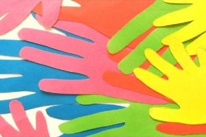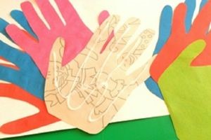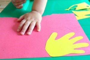 - Возьмите 10 листов бумаги разных оттенков. Поставьте на них свои ладошки, обведите, а затем вырежьте их все. Получились разноцветные ладошки – это детали аппликации.