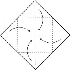 - Согните сначала по одной диагонали, затем по другой, разогните. Сделайте загибы всех углов в центр.