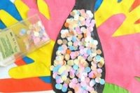 - На основную часть туловища наносим клей и аккуратно приклеиваем приготовленные конфетти и глазки на голове. Оригинальная жар-птица готова.