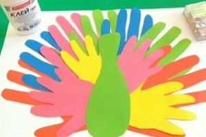 - Посередине белого чистого листа наклейте в произвольном порядке все ладошки так, чтобы в итоге композиция походила на хвост жар птицы. Сверху приклейте туловище и верх головы.