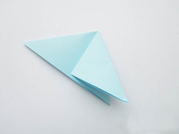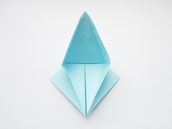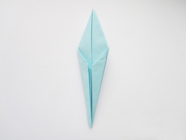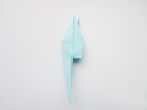 Далее нужно взяться за острые края и немного поднять их к верху. Вы заметите, что получился хвост и голова журавлика.