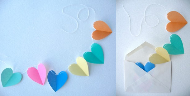 Чтобы получились сердечки, складываем квадрат и у изгиба рисуем половину сердца. Вырезаем и разворачиваем. У вас должно получится полное сердечко. Цвет бумаги может быть классическим красным или же разноцветным. Теперь нанизываем сердца на нитку, чтобы получилась гирлянда (как на рисунке выше). Также, можно подписать валентинки. Затем помещаем в конверт. Поздравительное письмо с сердцами для вашей второй половинки готово.