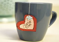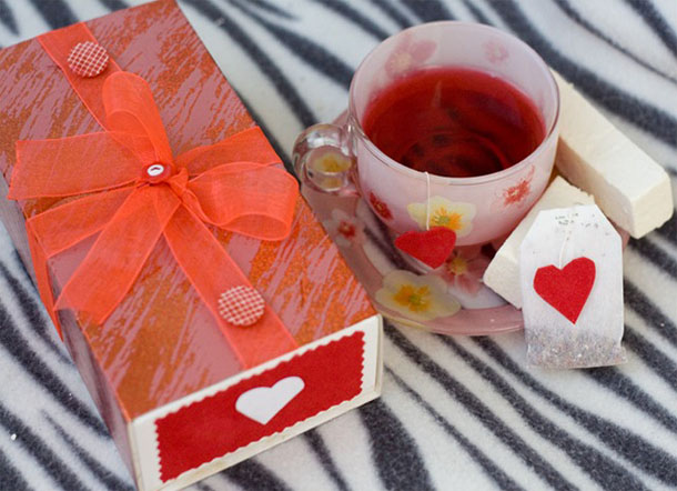 Все достаточно просто. Склеиваем два вырезанных сердца, кладем между ними ниточку из чайного пакетика. И вот уже обыденное чаепитие приобретает совсем другой вид.