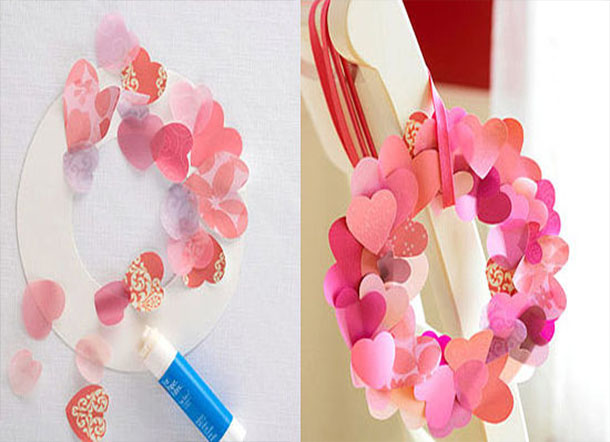 На дверях красиво будет смотреться венок из сердец. Чтобы его сделать, нужно вырезать круг. Для этого лучше взять плотный картон, чтобы венок не погнулся. Затем, вырезаем сердечки разных размеров и цветов из цветной бумаги. Наклеиваем их в хаотичном порядке, заполняя круг. Края сердечек не приклеиваем. Это сделает венок объемным.