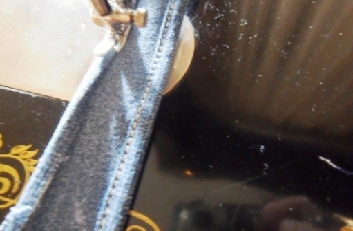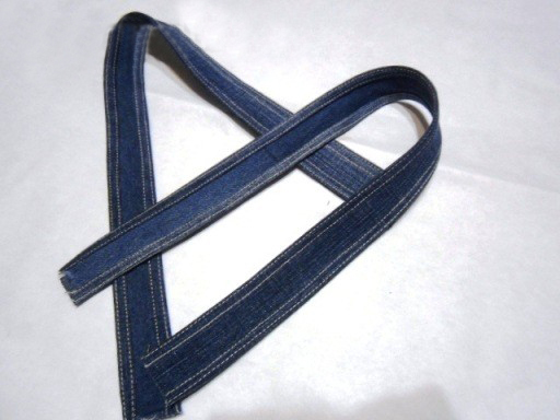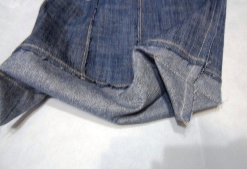 7. Теперь нужно сделать ручки для джинсовой вещи. Для этого изнанкой наружу кладут верх и низ от заготовленных выкроек друг на друга. Нижнюю часть выравнивают по середине верхней, а затем выступающие края загибают и прострачивают. Для этого лучше использовать отделочные двойные строчки.