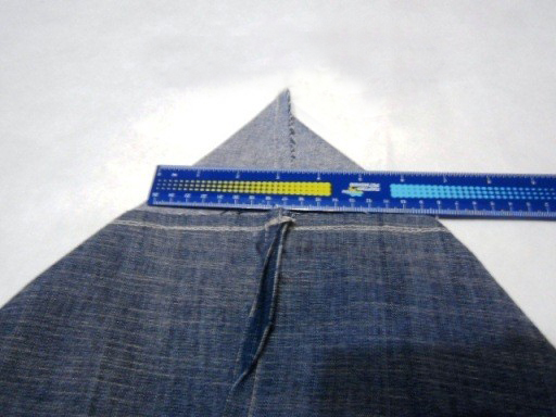 2. Выверните подготовленную штанину наизнанку и прострочите нижний край. Углы загните и прострочите так, чтобы получился треугольник.