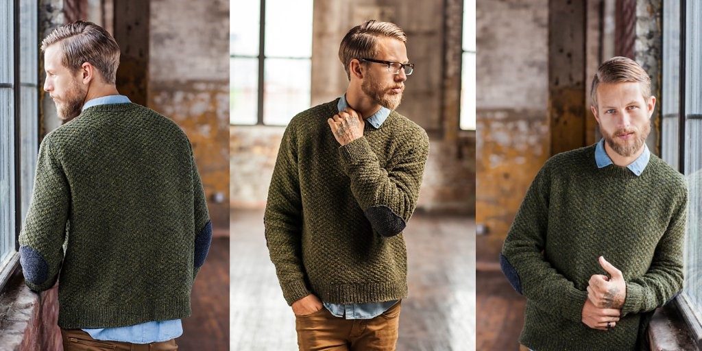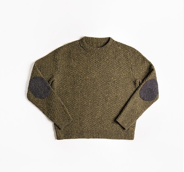 В основе этого свитера заложен узор под названием «шахматка». Главные особенности подобных пуловеров: болотный цвет, шерстяная пряжа, двойная горловина и, конечно же, вставки на локтях.
