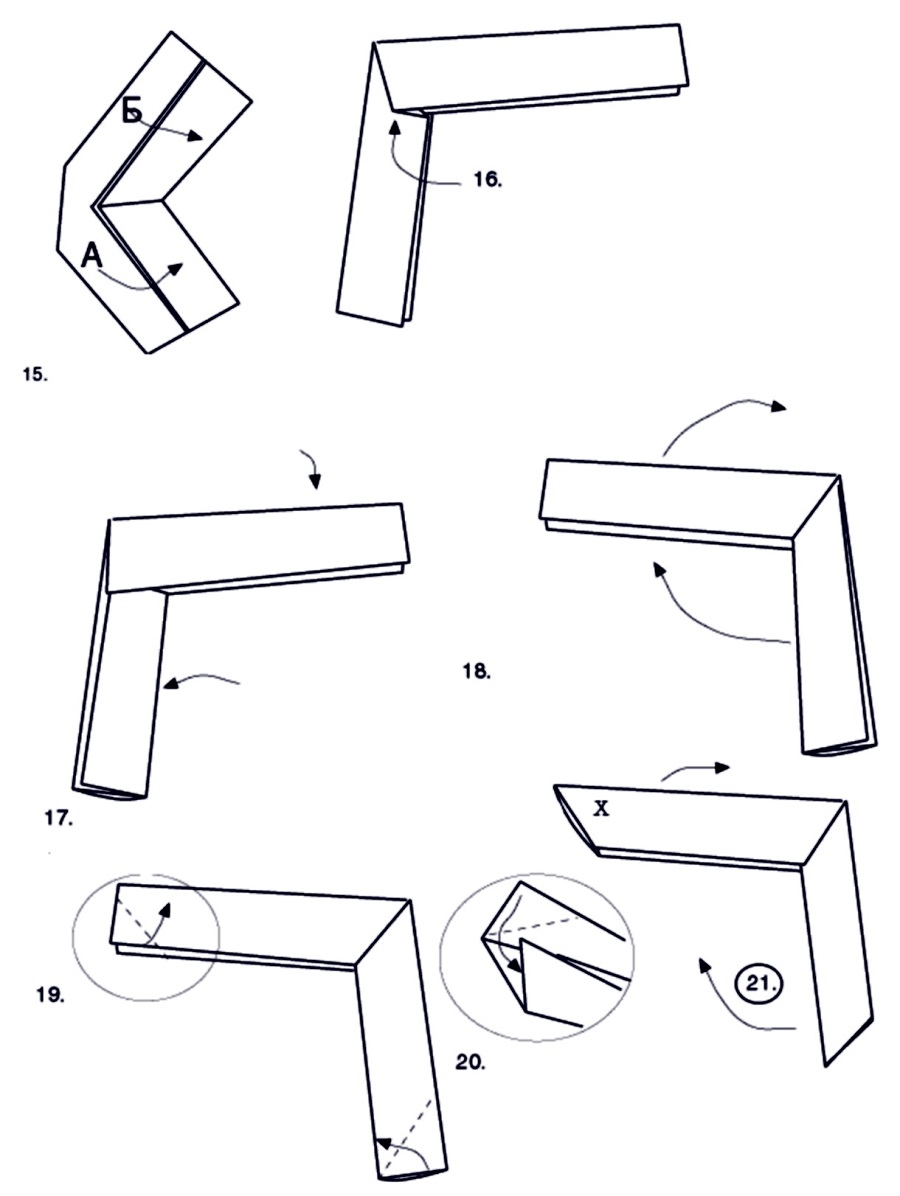 - Сформируйте угол с одной стороны конструкции и повторите это с другой стороной (рис.19). Тщательно проведите линейкой по складкам, разогните фигуры обратно и снова загните, но теперь уже во внутреннюю часть. Увеличенная часть схемы в кругу находится на рис.20;