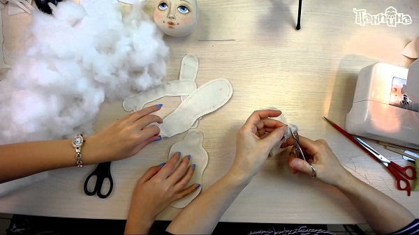 6. Отверстия для рук и ног вогните внутрь, поместите туда детали, а затем прошейте потайным швом по кругу.