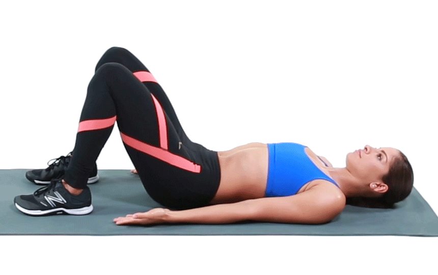 - Ягодичный мостик (закрепление мышц живота). Лежа на спине ноги согните в коленях. Руки вытянуты по длине тела ладонями вверх. Медленно поднимайте ягодицы вверх до момента образования прямой линии между коленями и животом, задержитесь и возвращайтесь спокойно в исходную позицию. 2 подхода по 25 повторений.
