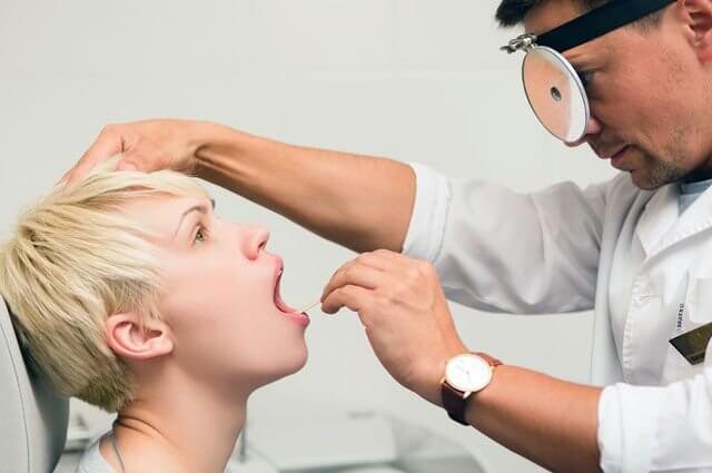 Затем смотрит горло - во время осмотра ротовой полости врач уделяет внимание каждой мелочи, начиная с того, ухаживает ли пациент за зубами, нет ли высыпаний на внутренней поверхности щек, нет ли болезненности десен, обязательно смотрит заднюю стенку глотки, миндалины, дужки миндалин.