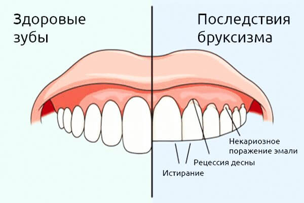Скрежет в ротовой полости негативно сказывается на здоровье эмали зубов. Продолжительный бруксизм может привести к раскрашиванию и ломке зубов.